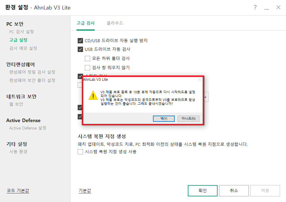 V3 제품 보호 종료 후 10분 후에 자동으로 다시 시작하도록 설정이 되어 있습니다.