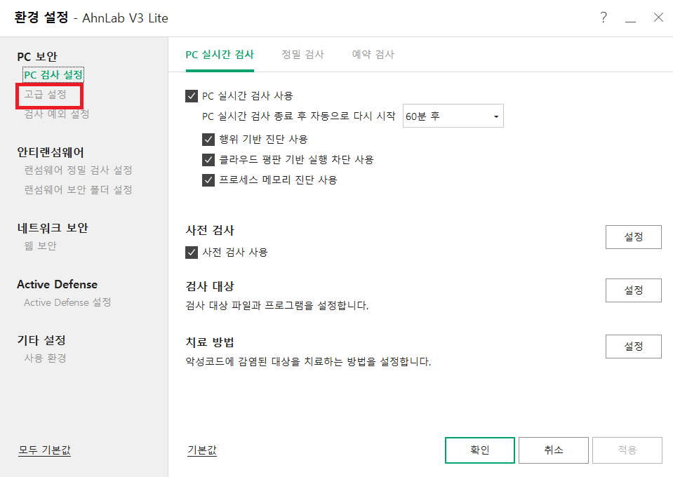 PC 보안에서 고급 설정을 클릭을 합니다.