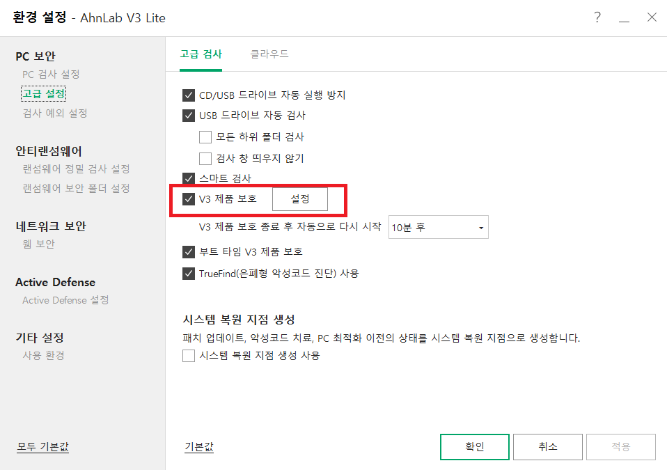V3 제품 보호 항목을 체크 해제를 합니다.